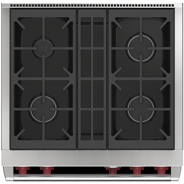 Газовая варочная поверхность состоит из четырёх горелок, мощностью от 2,7 кВ (для топления) до 5,3 кВ (для быстрого закипания и интенсивной обжарки) . Запатентованная двухуровневая конструкция газовой горелки Wolf позволяет максимально точно контролировать температуру нагрева. Система реподжига автоматически зажигает горелку при её заливе.
